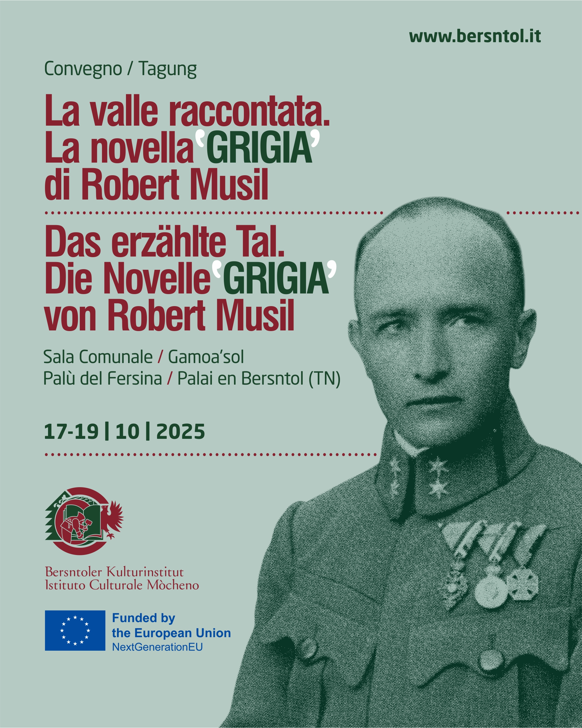 Da venerdì 17 a domenica 19 ottobre, a Palù del Fersina, ci sarà il convegno La valle raccontata. La novella "Grigia" di Robert Musil: tre giorni di incontri, letture e riflessioni per riscoprire Grigia, la celebre novella di Musil, e il suo profondo legame con il paesaggio e la cultura della comunità mòchena. L'iniziativa si concluderà domenica 19 ottobre con una passeggiata lungo l'itinerario letterario "Musil en Bersntol", accompagnata da letture della novella e dei Diari, scritti da Musil durante il suo periodo in valle del Fersina come tenente dell'esercito austro-ungarico.